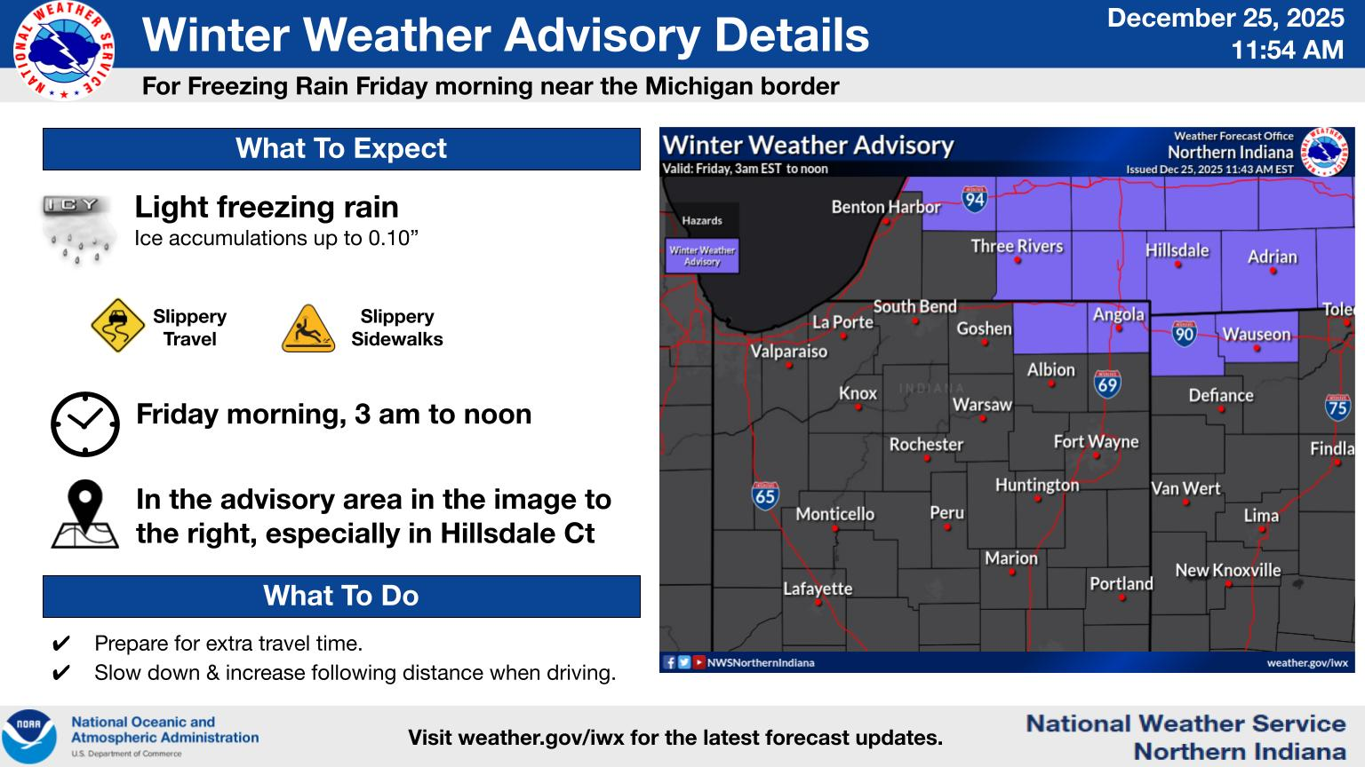 A period of freezing rain will likely create hazardous travel across far northeast Indiana, far northwest Ohio and south-central Michigan late Thursday night into Friday morning. (NWS)