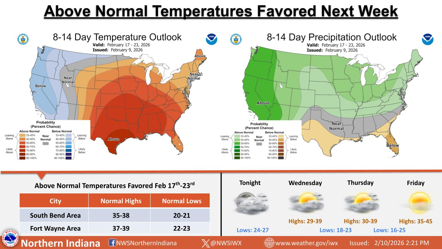 Dry weather continues through the rest of the work week. Behind today’s series of cold fronts, temps fall for today, but trend warmer into early next week. In fact, later next week through the weekend, leans above normal for both temperature and precipitation. (NWS)