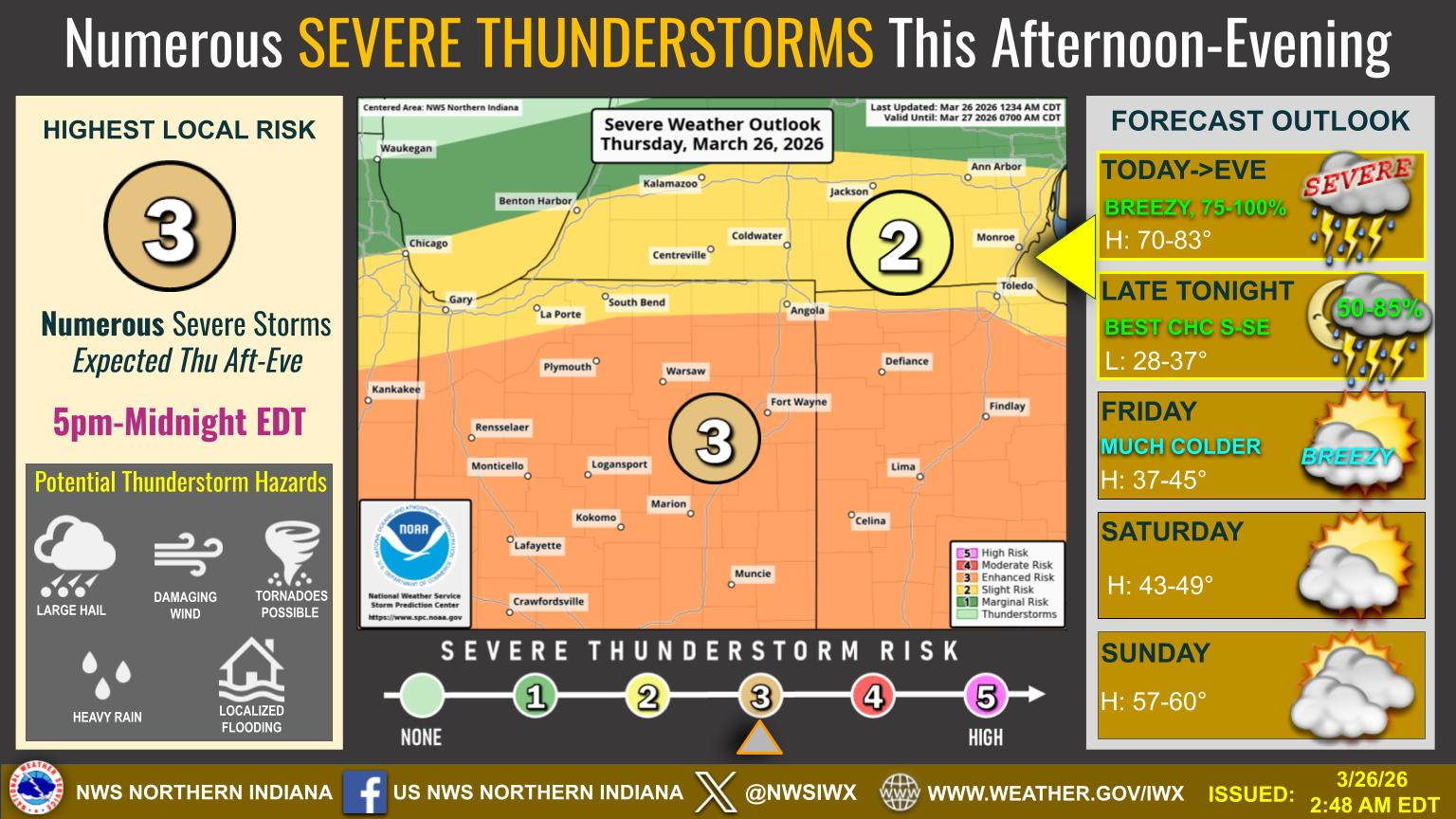 Numerous strong to severe thunderstorms are expected between 5pm and midnight today. All hazards are on the table, including a few tornadoes. Rain and storms taper off from northwest to southeast overnight. It will be breezy and much colder tomorrow, with highs near 40. Dry conditions persist this weekend, with temps in the 40s Saturday climbing to around 60 on Sunday. Highs will be near70 on Monday. (NWS)